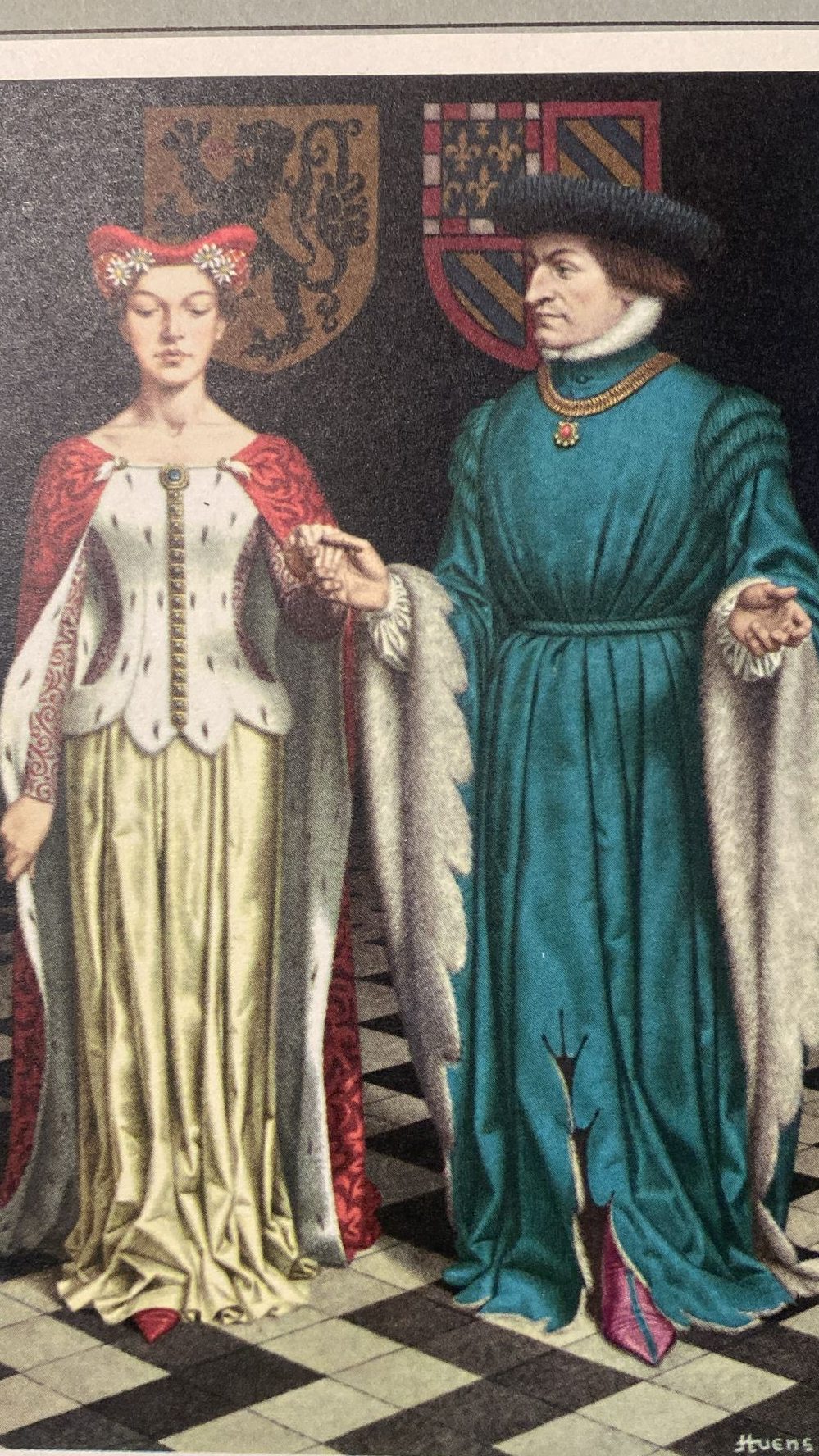 Illustrator Huens maakte een prent over het huwelijk van de 19-jarige Marguerite van Male met haar gemaal Filips De Stoute. Ze ziet er leuk uit met de margrieten in het haar.